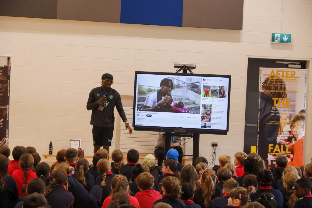 We were very lucky to have a visit from professional footballer and certified coach Romeo Booto who took our 4th, 5th and 6th classes for an inspirational talk on his journey from The Democratic Republic of Congo to Mosney and how football gave him an outlet to become a role model for children today. This was documented in his movie ‘After the Fall’. He was kind enough to do individual class training sessions with each of the classes after the talk.